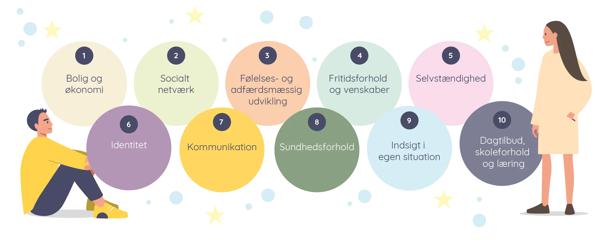 To gange årligt – i april og oktober – sætter socialkonsulenten og den enkelte borger sig sammen og gennemgår spørgsmål som omhandler borgerens udvikling indenfor en række områder. Borgeren og socialkonsulenten har hver deres kolonne, hvor de angiver, i hvor høj eller lav grad borgeren oplever ressourcer og kompetencer indenfor syv overordnede områder:
